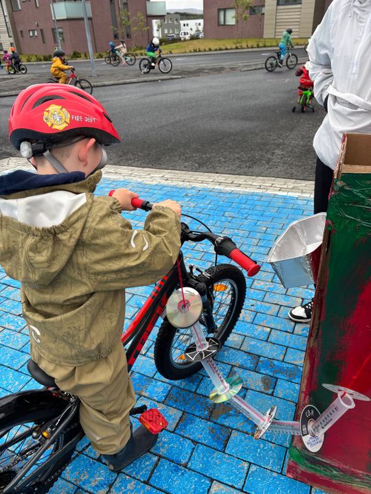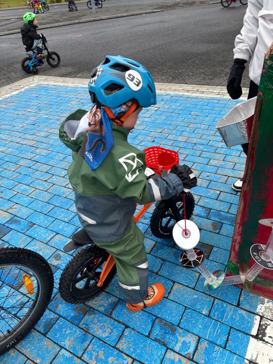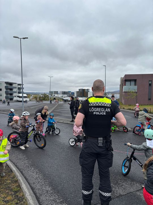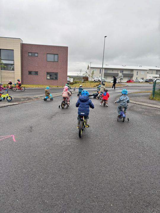 Mikið stuð og stemmning er búin að vera í dag á hjóladeginum. Börnin hafa undanfarna daga lagt mikið í undirbúninginn fyrir hjóladaginn. Þau hafa verið að skapa bensínstöð, þvottastöð, verkstæði, búð, umferðaskilti, umferðaljós og margt fleira. Á hjóladaginn voru svo hjólin þvegin, löguð, tekið bensín, stoppað í búðinni og hjólað um allan garðinn og bílastæðið. Löggan kom í heimsókn og skoðaði hjálmana og hjólin hjá börnunum. Löggan spjallaði og lék einnig við þau. Börnin fengu svo límmiða og tattoo í kveðjugjöf áður en hún fór að sinna útköllum. Þessi heimsókn vakti mikla lukku og vorum við hæstánægð með þessa frábæru gesti.